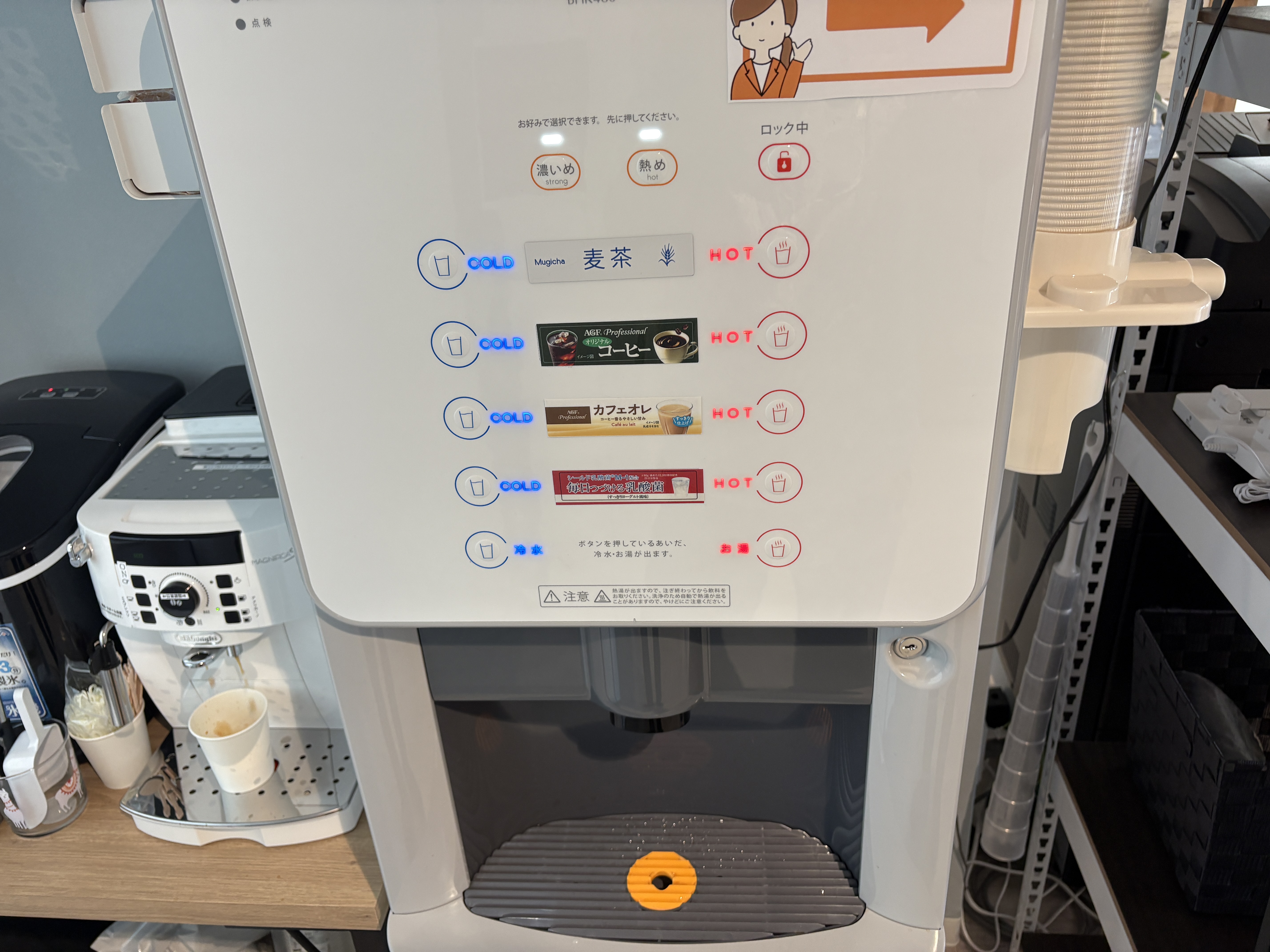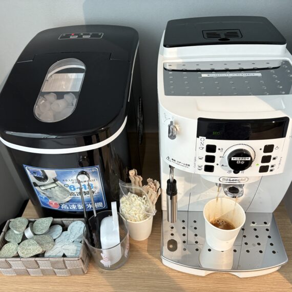 充実のフリードリンクコーナー。豆から挽くタイプのコーヒーマシンや、季節に応じたドリンク類。カフェオレ、ココア、紅茶など多数。