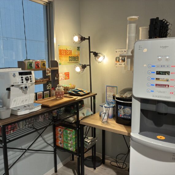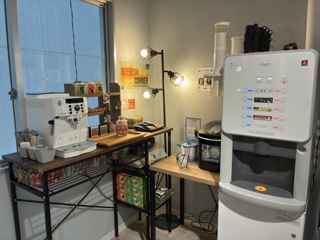 豆から挽くタイプのコーヒーマシンやカフェオレ、ココア、紅茶、お茶などのフリードリンクコーナーがパワーアップ。みそ汁やスープ、ナッツやラムネも加わり、小腹も満たせるリフレッシュコーナーに生まれ変わりました。